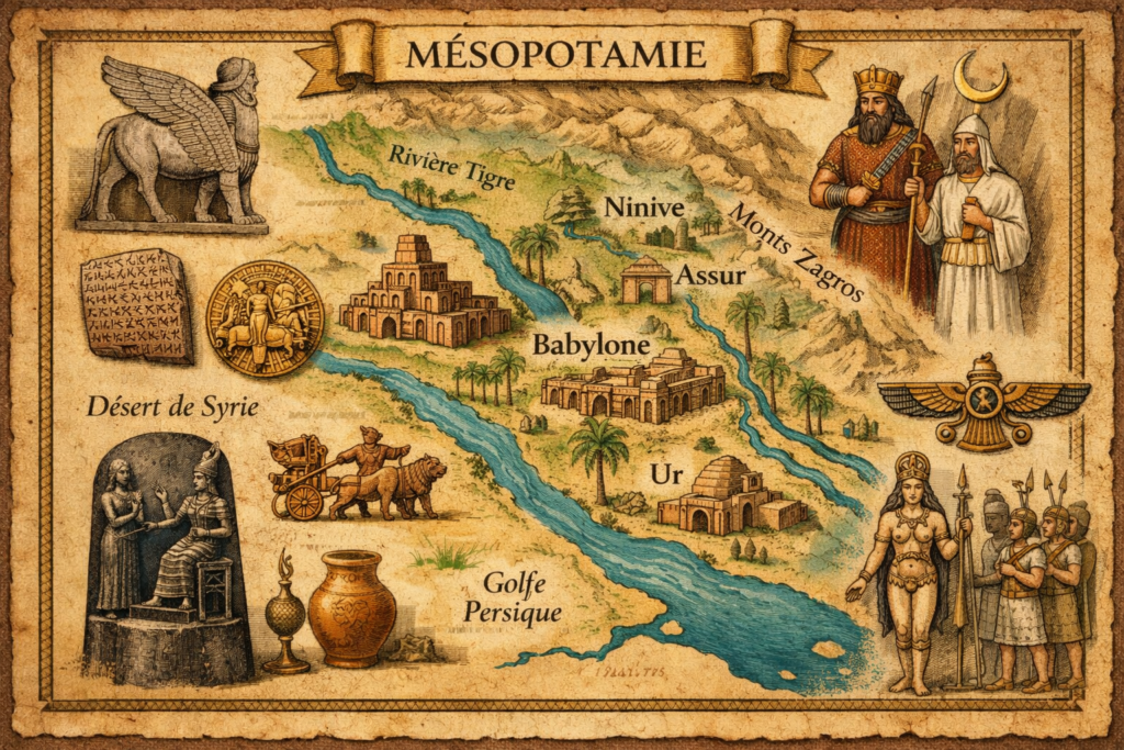 La Mésopotamie est l’une des plus anciennes régions de civilisation humaine, souvent appelée « berceau des civilisations ». Son nom vient du grec ancien et signifie « la terre entre les fleuves », car elle se situe entre le Tigre et l’Euphrate, dans une zone qui correspond aujourd’hui principalement à l’Irak.