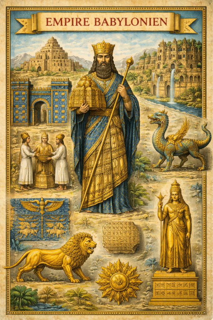Babylone connaît plusieurs phases de grandeur et de déclin : l’Ancien royaume (Hammurabi), la domination kassite, puis l’Empire néo-babylonien. Dans cette dernière phase, Nabuchodonosor II fait de Babylone une capitale splendide. Sous son règne, Babylone devient un symbole de puissance : architecture monumentale, expansion urbaine et rayonnement culturel la caractérisent.
